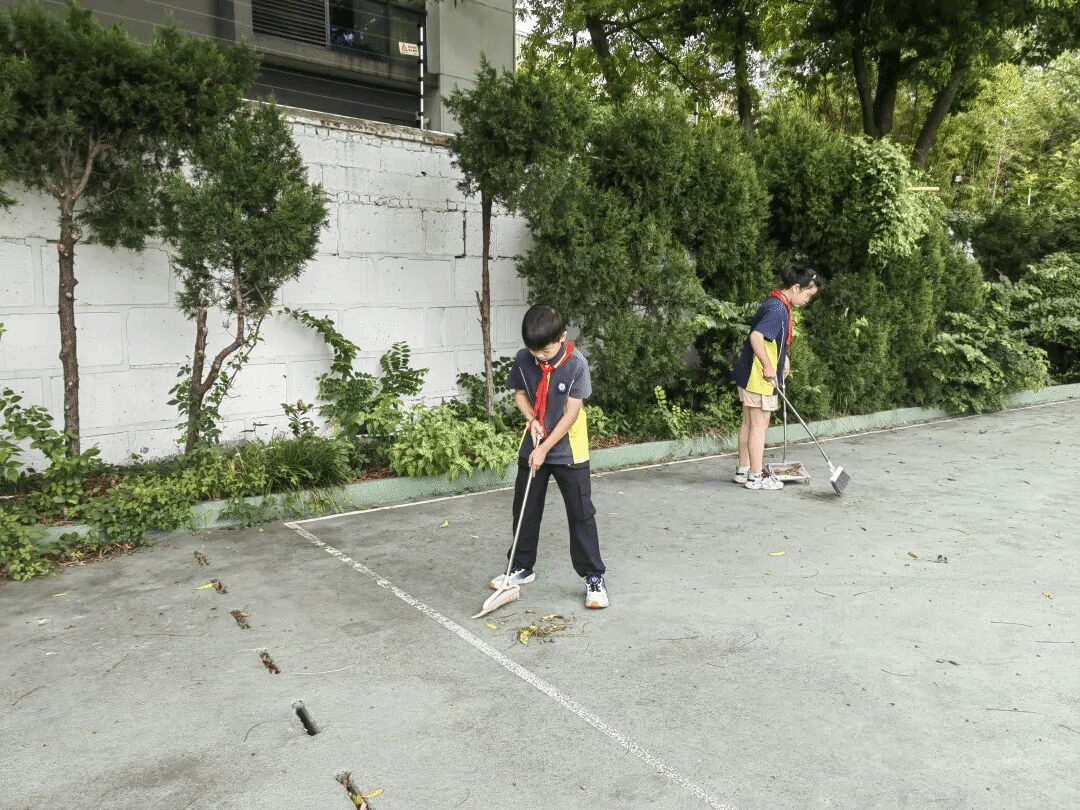 同学们分工有序,默契配合:有的仔细清理花坛中的落叶杂草,有的认真打扫走道,还有的同学穿梭于操场各个角落捡拾垃圾。