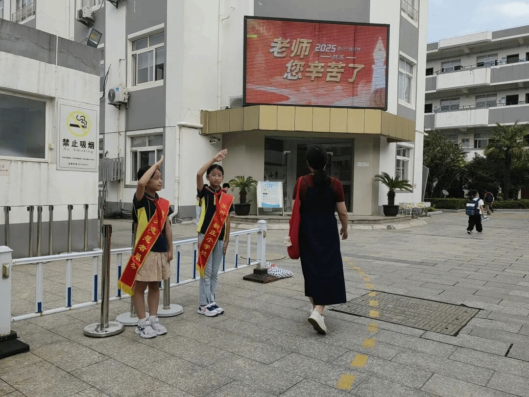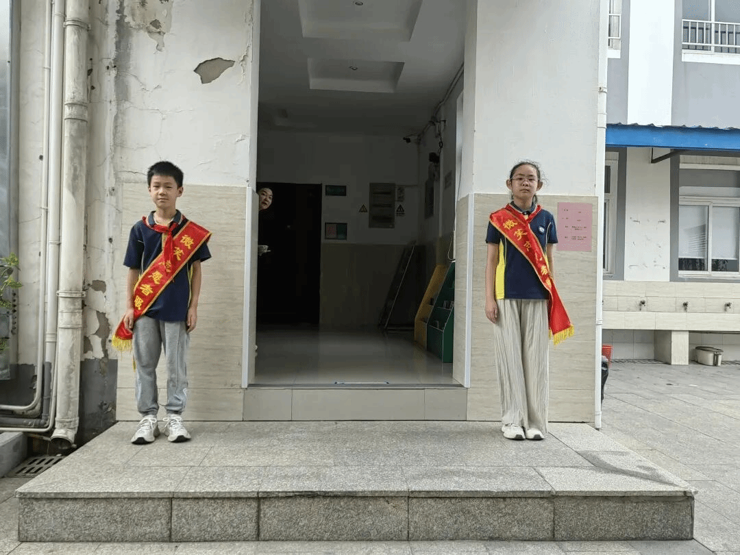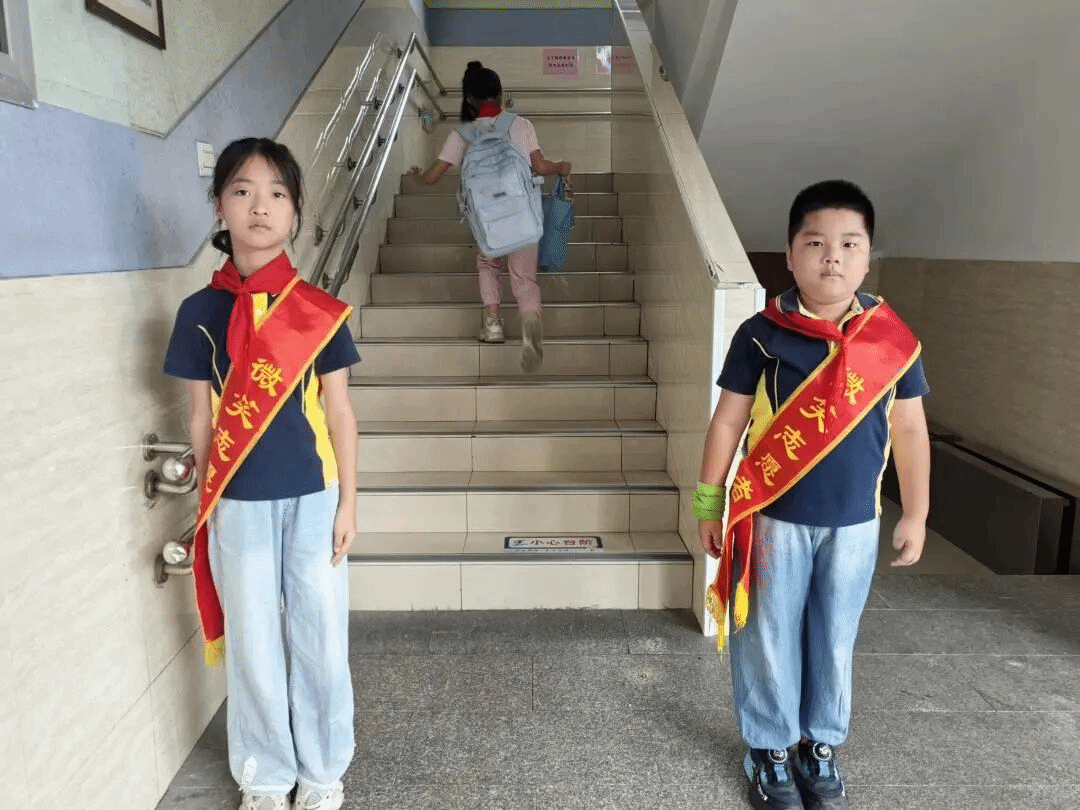 校门口和楼梯口均有红领巾志愿者坚守岗位,他们以温暖的微笑迎接师生,积极引导秩序,悉心守护校园安全。
